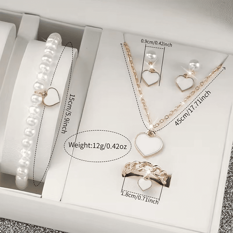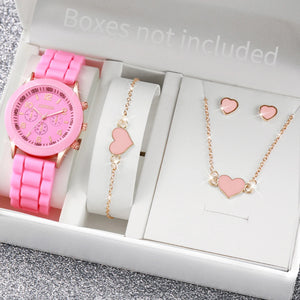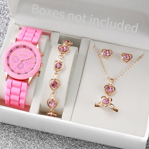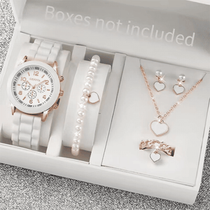 This coordinated six-piece set features a stylish analog quartz watch with a comfortable silicone band. Accompanying heart and pearl themed jewelry includes a matching necklace, bracelet, ring, and earrings for a complete look. The durable rubber casing and precise movement offer reliable timekeeping for daily wear or special events. Elevate your accessory collection with this versatile and sophisticated fashion ensemble.